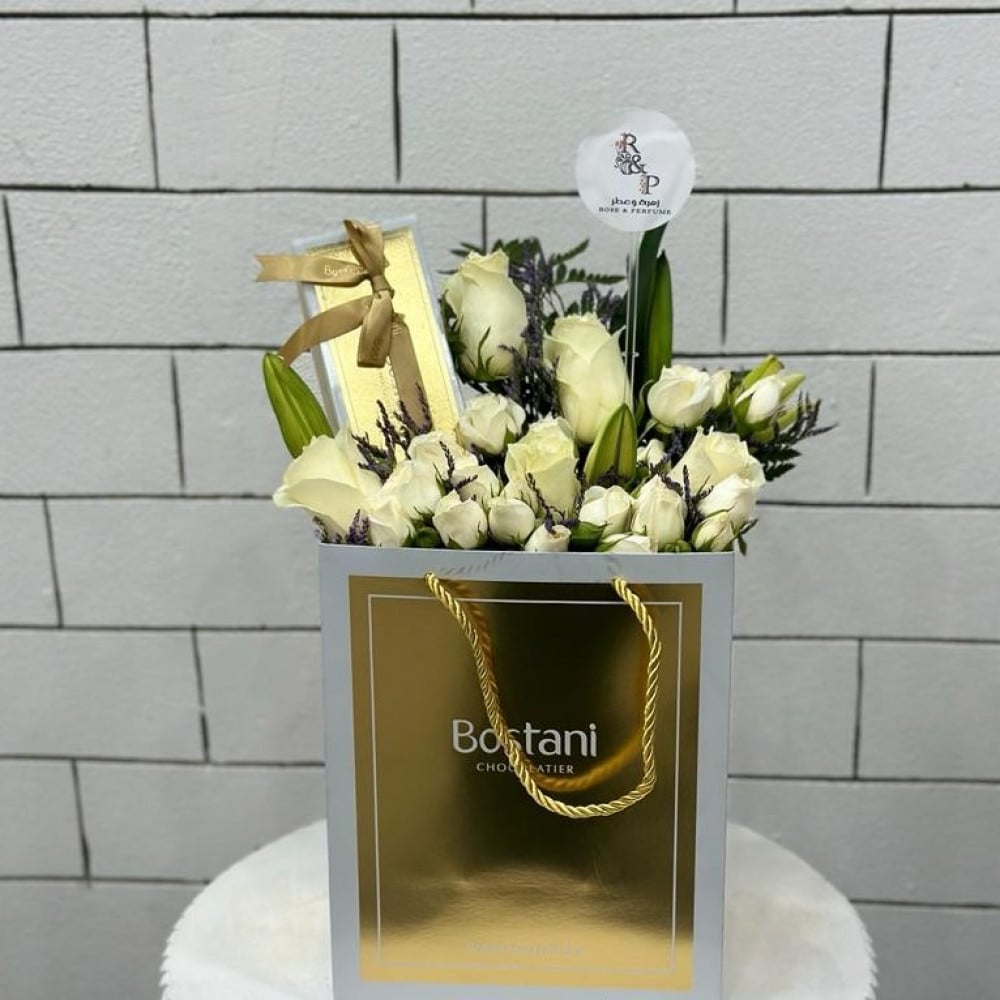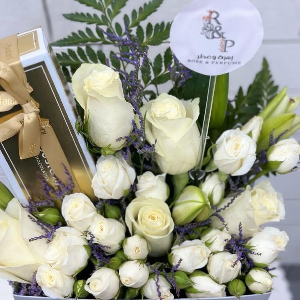 سلة شوكلت بستناني 250 جرام مع تنسيق انيق من الجوري الابيض والبيبي روز الابيض بي الاضافة لي اكسسوارات